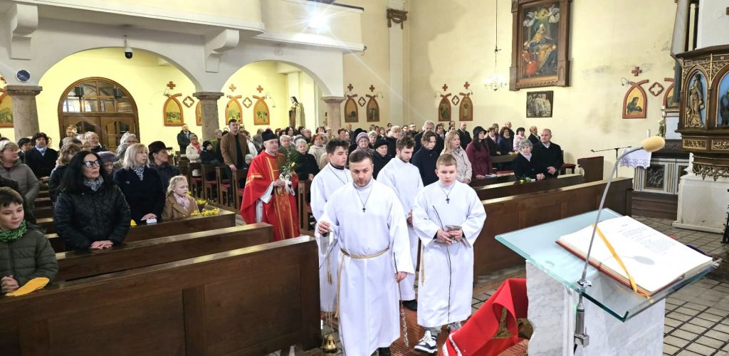 A szertartás kezdetén esperes-plébánosunk a szokott módon üdvözölte a népet, megáldotta és megszentelte a barkaágakat, majd az evangélium ünnepélyes felolvasása után elindította a liturgikus menetet, és a segédkezőkkel az oltárhoz vonult.